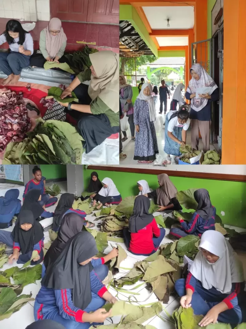 Salah satu hal unik dan patut diapresiasi dari pelaksanaan kegiatan tahun ini adalah penggunaan daun jati sebagai pembungkus daging qurban. Langkah ini merupakan bagian dari komitmen sekolah dalam mengurangi sampah plastik sekaligus membiasakan perilaku ramah lingkungan. Daun jati yang mudah terurai secara alami menjadi alternatif pengganti plastik yang tidak hanya fungsional, tapi juga bernilai edukatif tinggi bagi siswa.